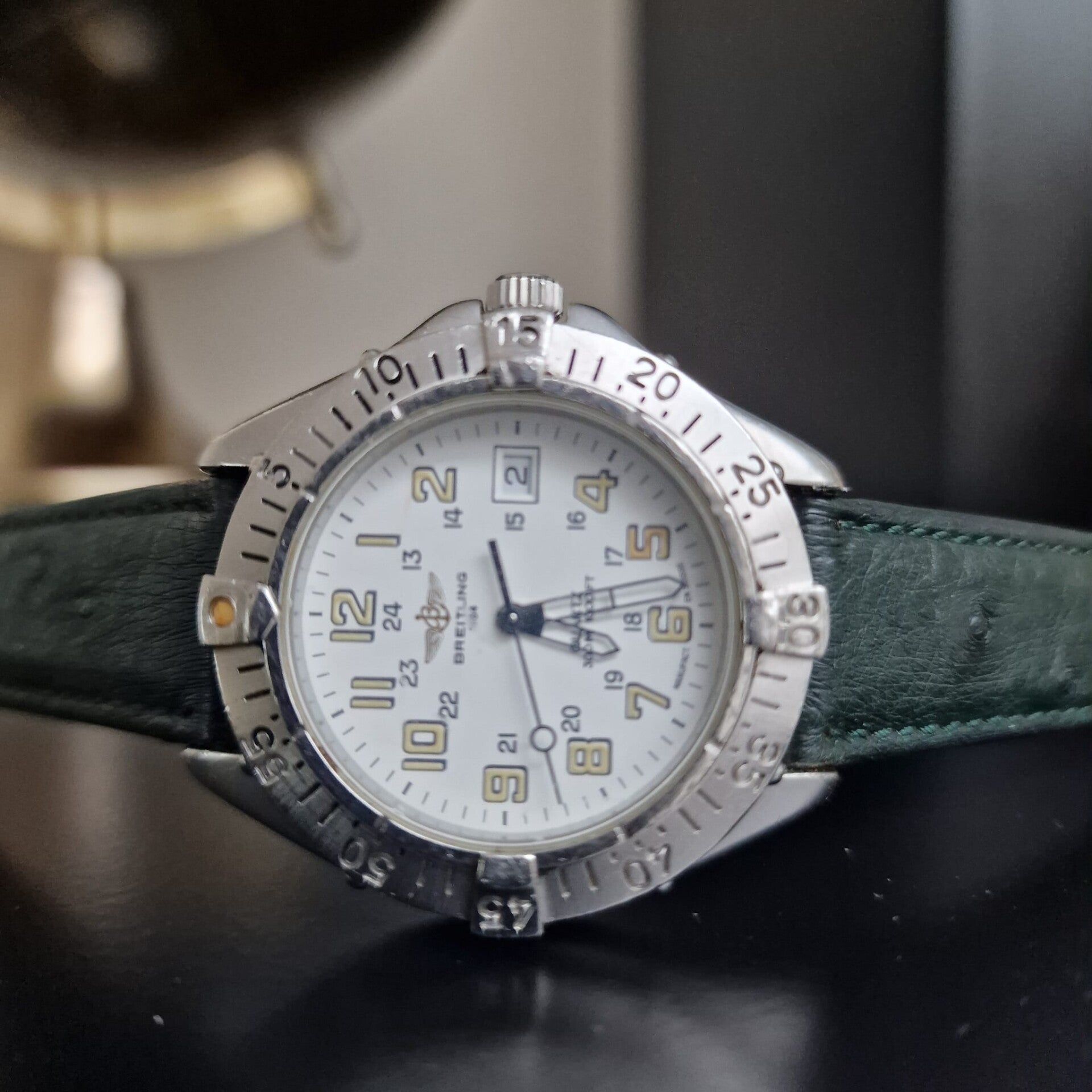 Breitling ColtA57035Quartz38 mmSaffierglasStalenkastWitte wijzerplaatBreitling gesp met doornsluitingRios struisvogelleren bandBox en omdoosJaar ongeveer 1995
