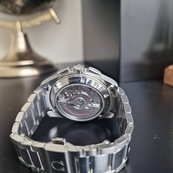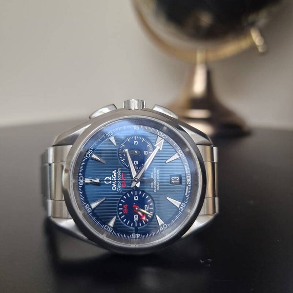 Omega Seamaster Aqua Terra GMT43 mmStaalWijzerplaat blauw ChronograafGMTSwiss madeAutomaat 960560 uur gangreserveDatum150 m waterdichthweidSaffieglasGlasbodemJaar ongeveer 2022Staat zeer goedGarantie jaService beurt gehad okt 2025!