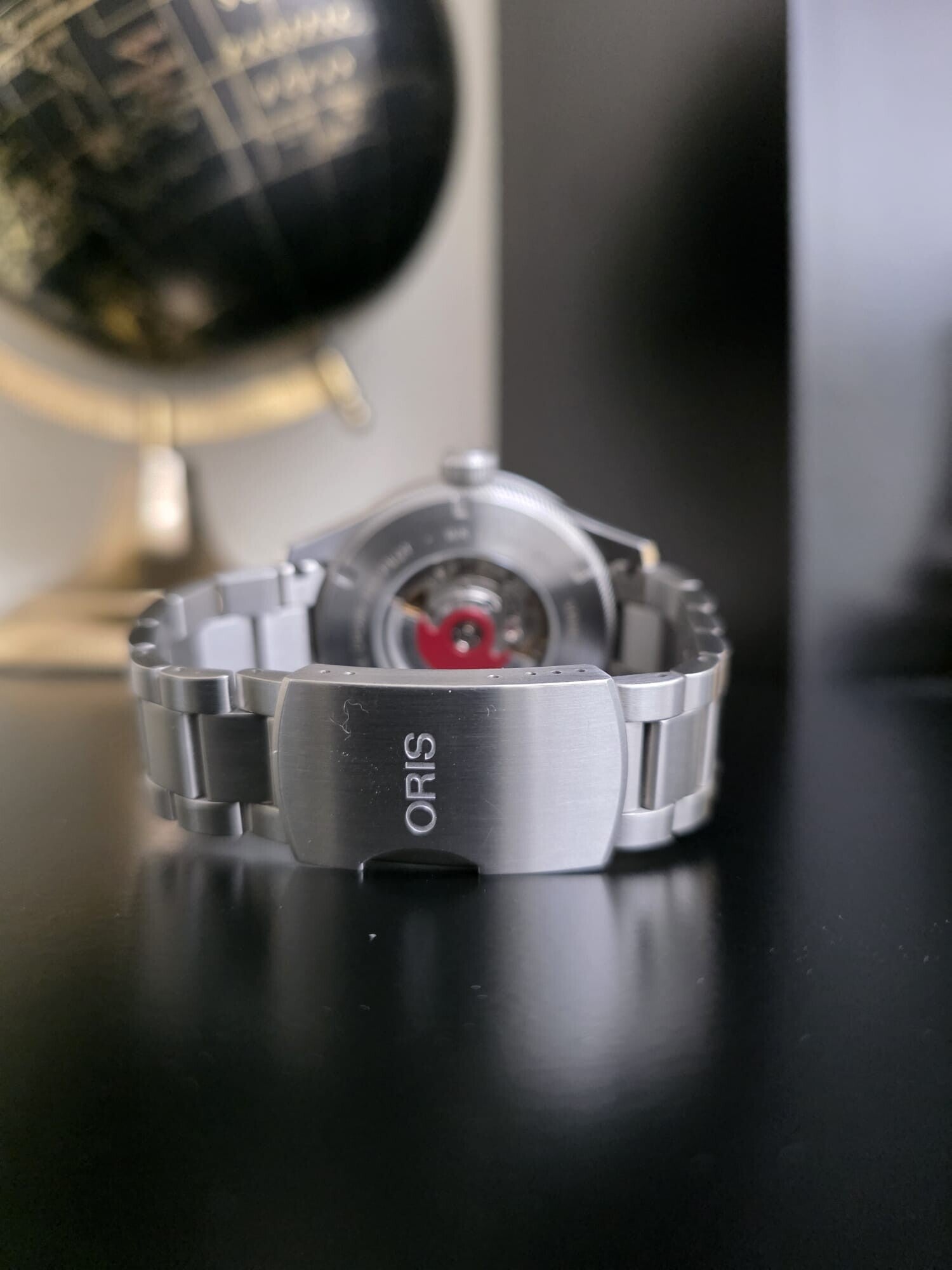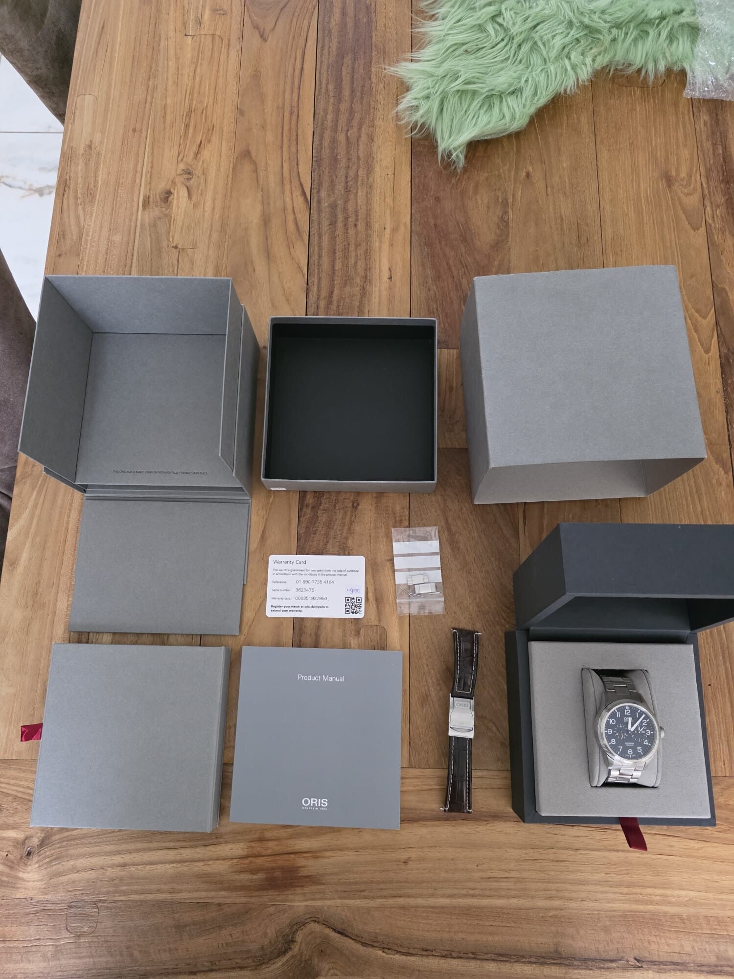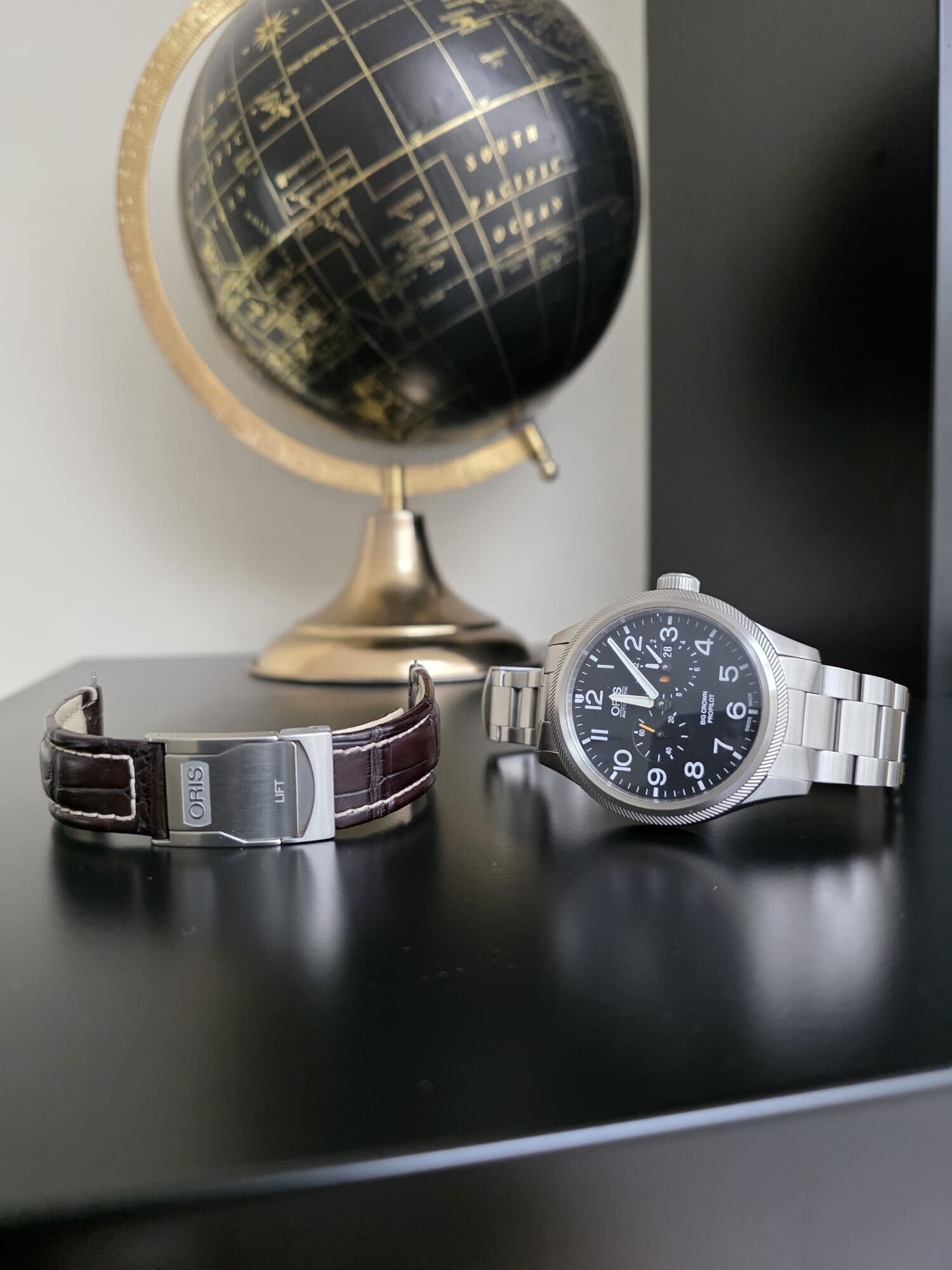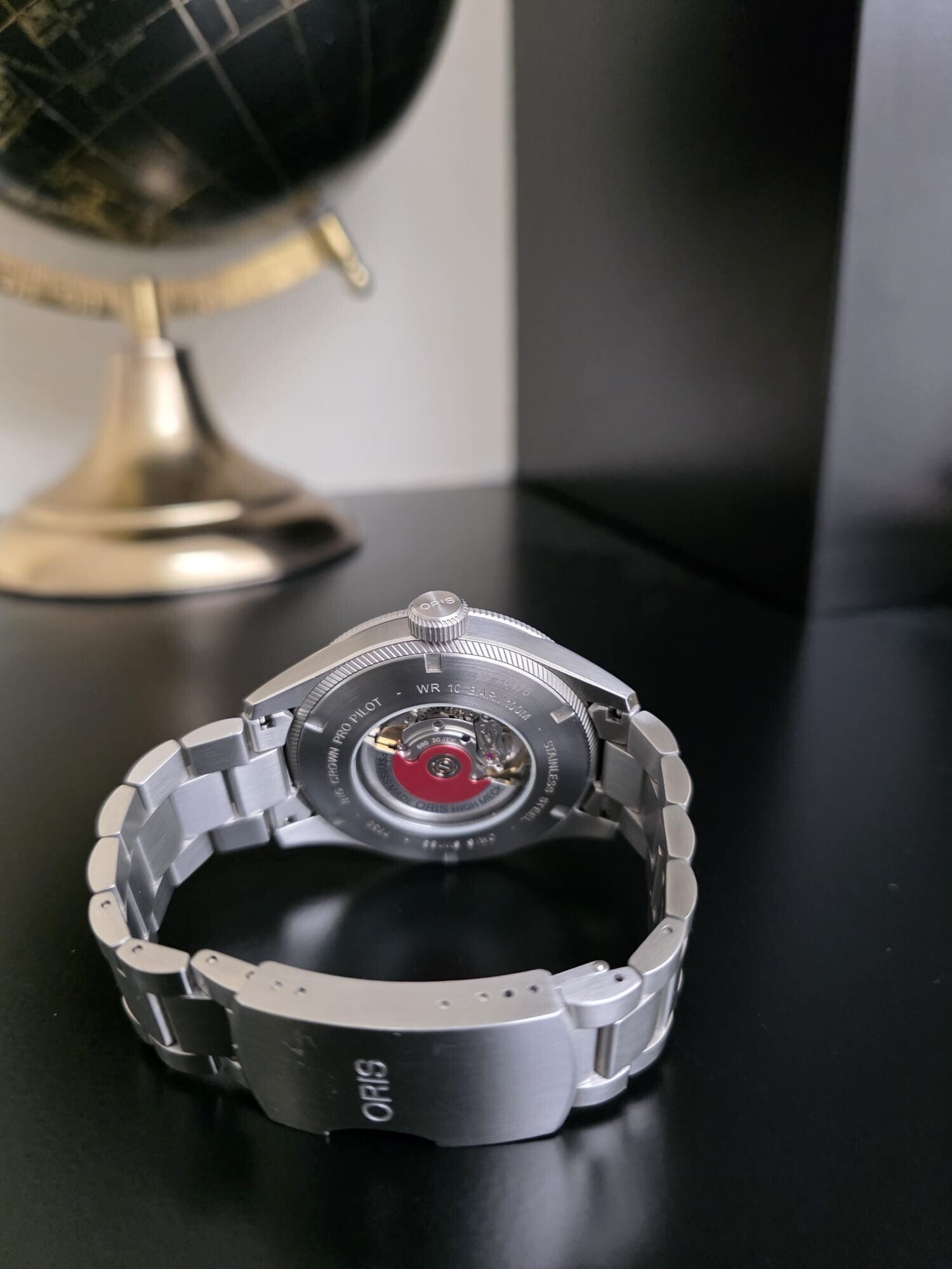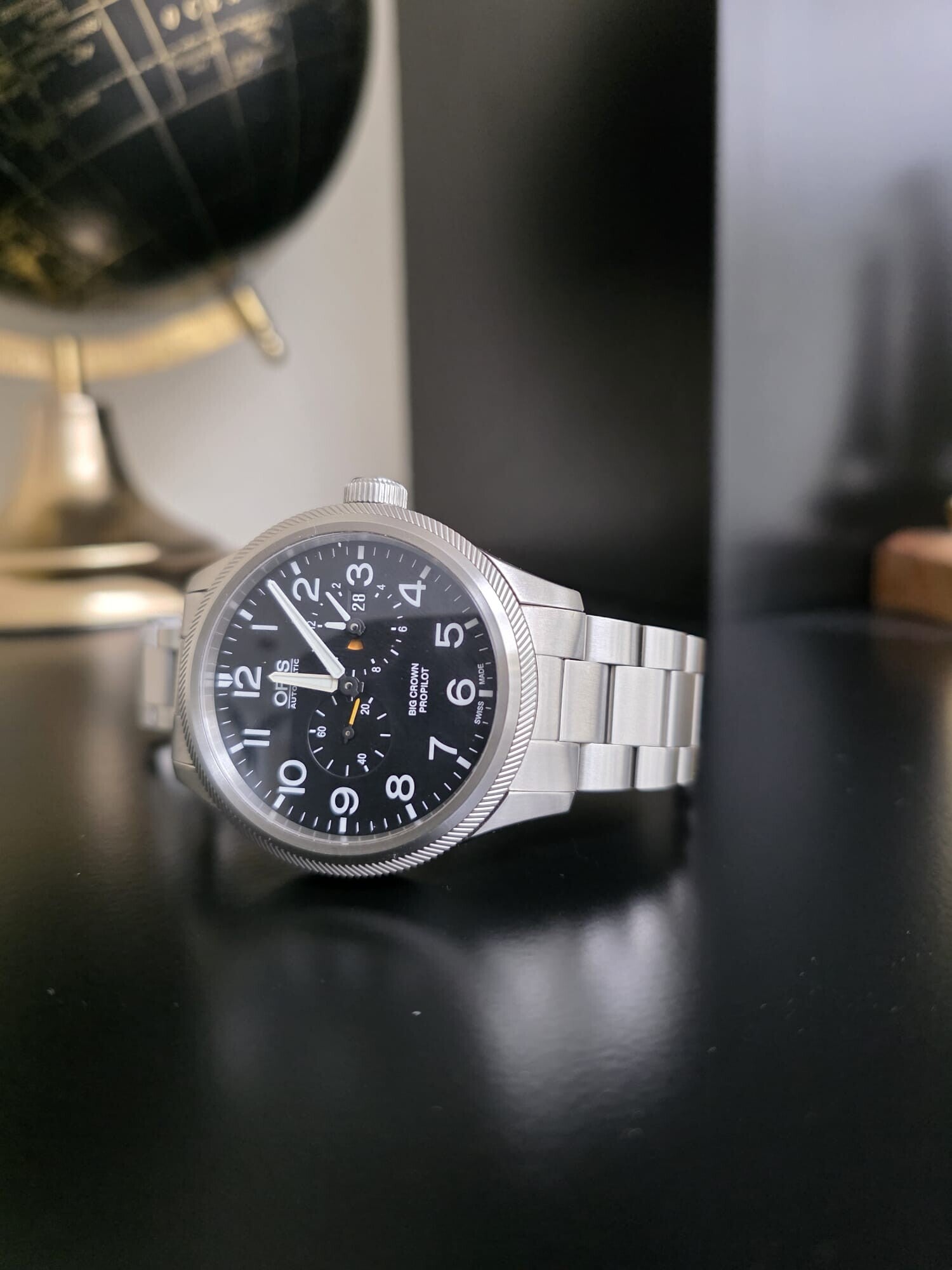Oris Big Crown Propilot WorldtimerSwiss madeAutomaat Oris cal. 69036 uur powerreservetikgetal 28,800jewels 3044.7 mm100 m waterdichtheidSaffierglasstaat nieuwjaar mei 20252.5 jaar garantie3945 euro prijs met 2 bandenonze prijs