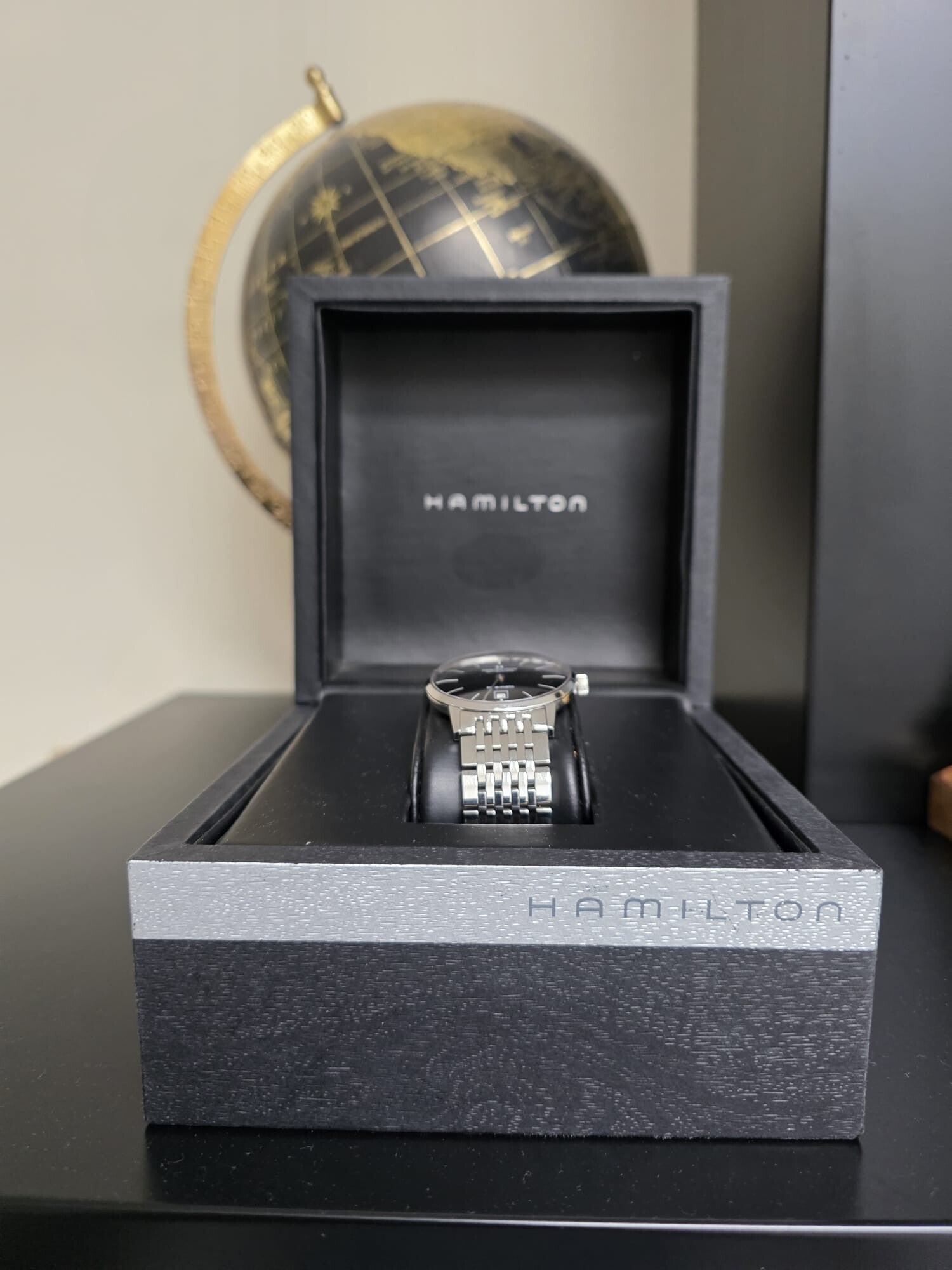 Hamilton Intra-MaticAutomaat Swiss madeGlas bodemDatumaanduidingStaalBand vlindersluiting5 ATMAnaloog42 mmZwarte wijzerplaatbox japapieren neestaat zganlist prijs 920 euroonze prijs 695 euro